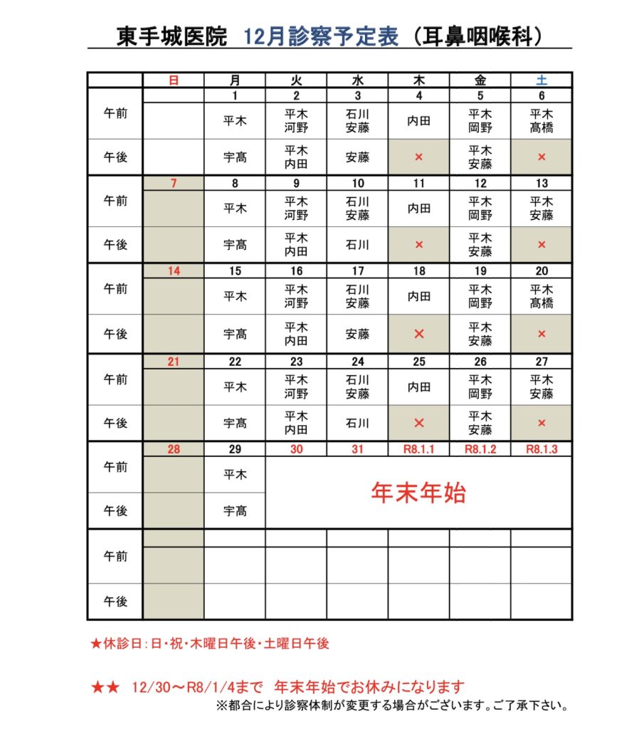 12月耳鼻咽喉科診察予定表となります⛄